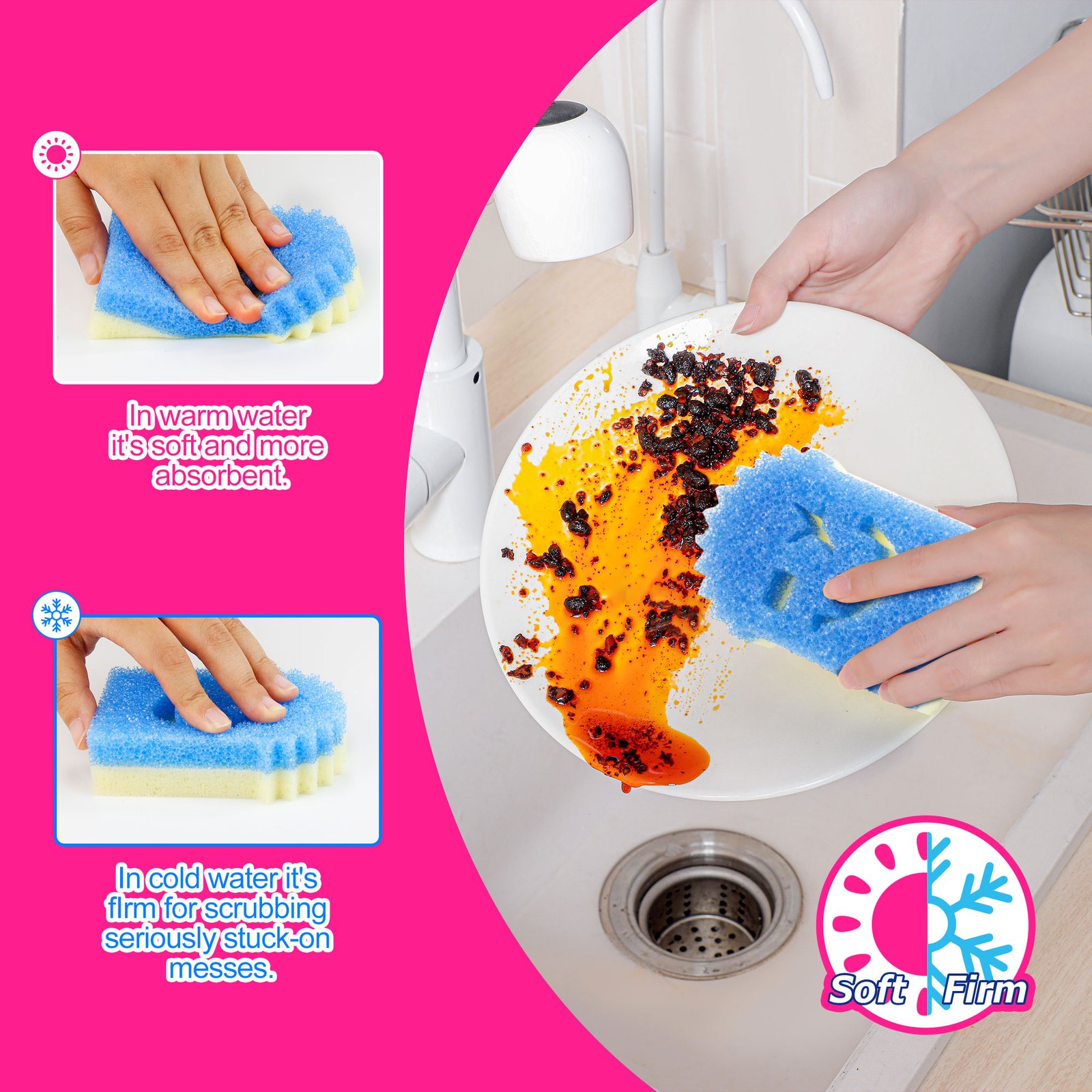 - 1.Temperature Controlled Scrub sponge set features a dual-sided design structure combining a dish scrubber with a non-scratch cleaning sponge. Soft in warm water and hard in cold water. Soak the sponge in cold water to tackle stubborn grease and dirt or in hot water for light cleaning and scrubbing