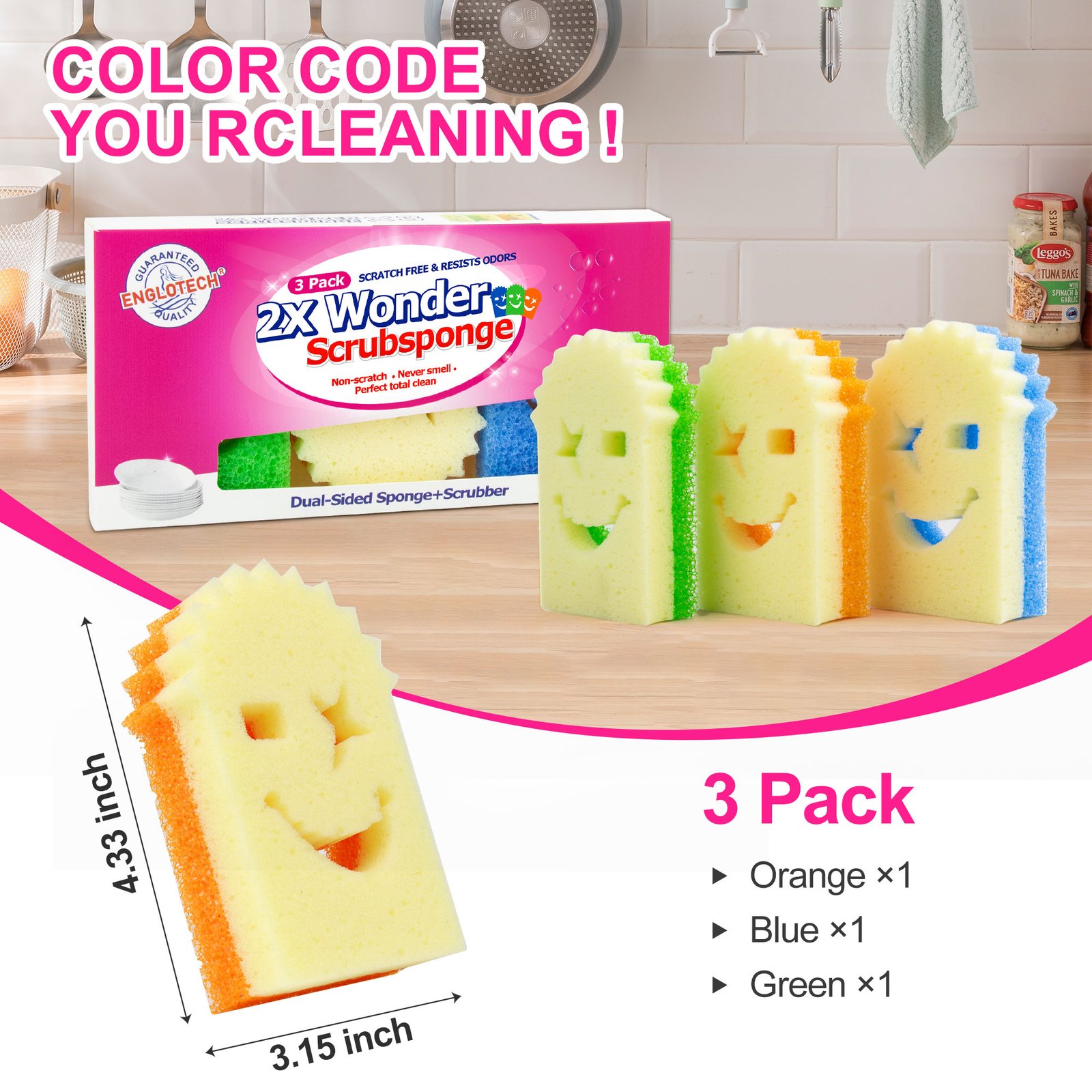 3 Pack Wonder Scrub Sponge Dual-Sided Temperature-Sensitive Sponge and Scrubber, Scratch-Free, Stain & Odor Resistant Multipurpose Dish Sponge for Kitchen