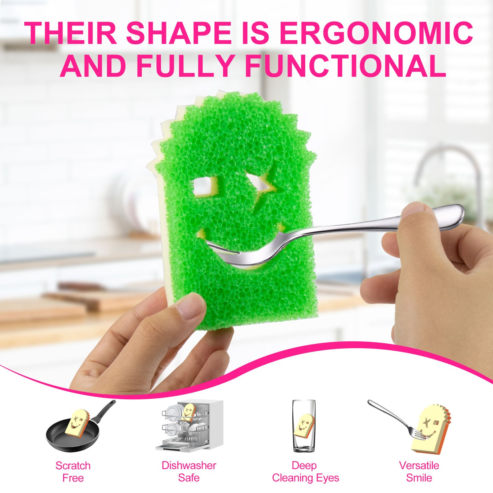 - 3.The unique and functional smile-shaped design to fit comfortably in your hand providing good grip and coverage, the curved shape allows you to get into tight spaces, ensuring a thorough and efficient cleaning every time. The design is cute and functiona